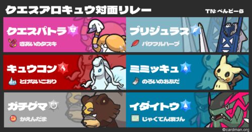 目次 1. はじめに 2.構築の組み方 2.1 構築選択の考え方 2.2 構築の完成経緯 3. 個別紹介 3.1 クエスパトラ 気合いの襷 3.2 Aキュウコン 溶けない氷 3.3 原種ガチグマ 火炎玉 3.4 ブリジュラス パワフルハーブ 3.5 ミミッキュ 呪いのお札 3.6 イダイトウ♂ 弱…